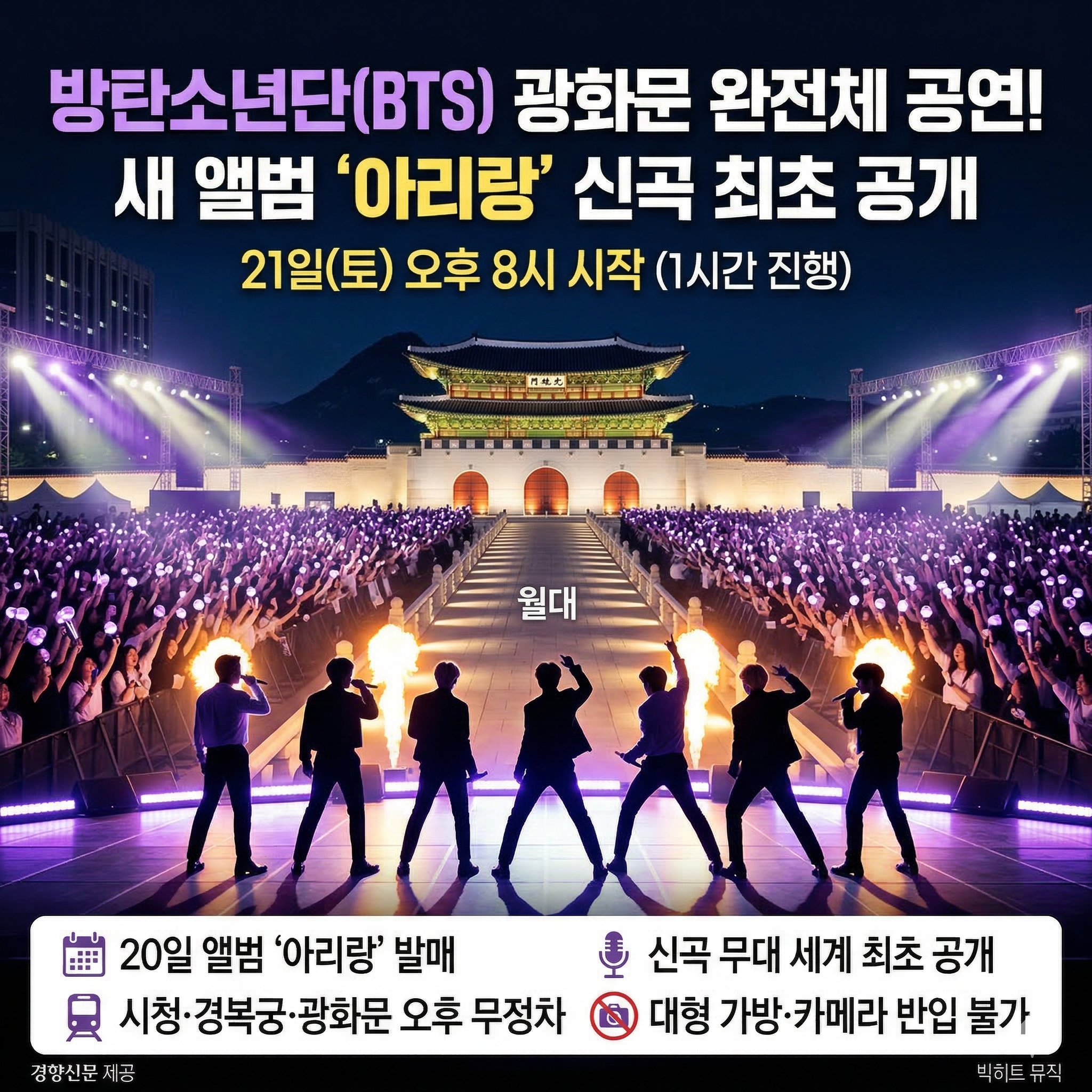 드디어 방탄소년단(BTS)의 완전체 컴백과 광화문 공연이 코앞으로 다가왔습니다! 오늘(20일)은 새 앨범이 발매되는 날이며, 내일은 역사적인 광화문 무대가 펼쳐집니다.