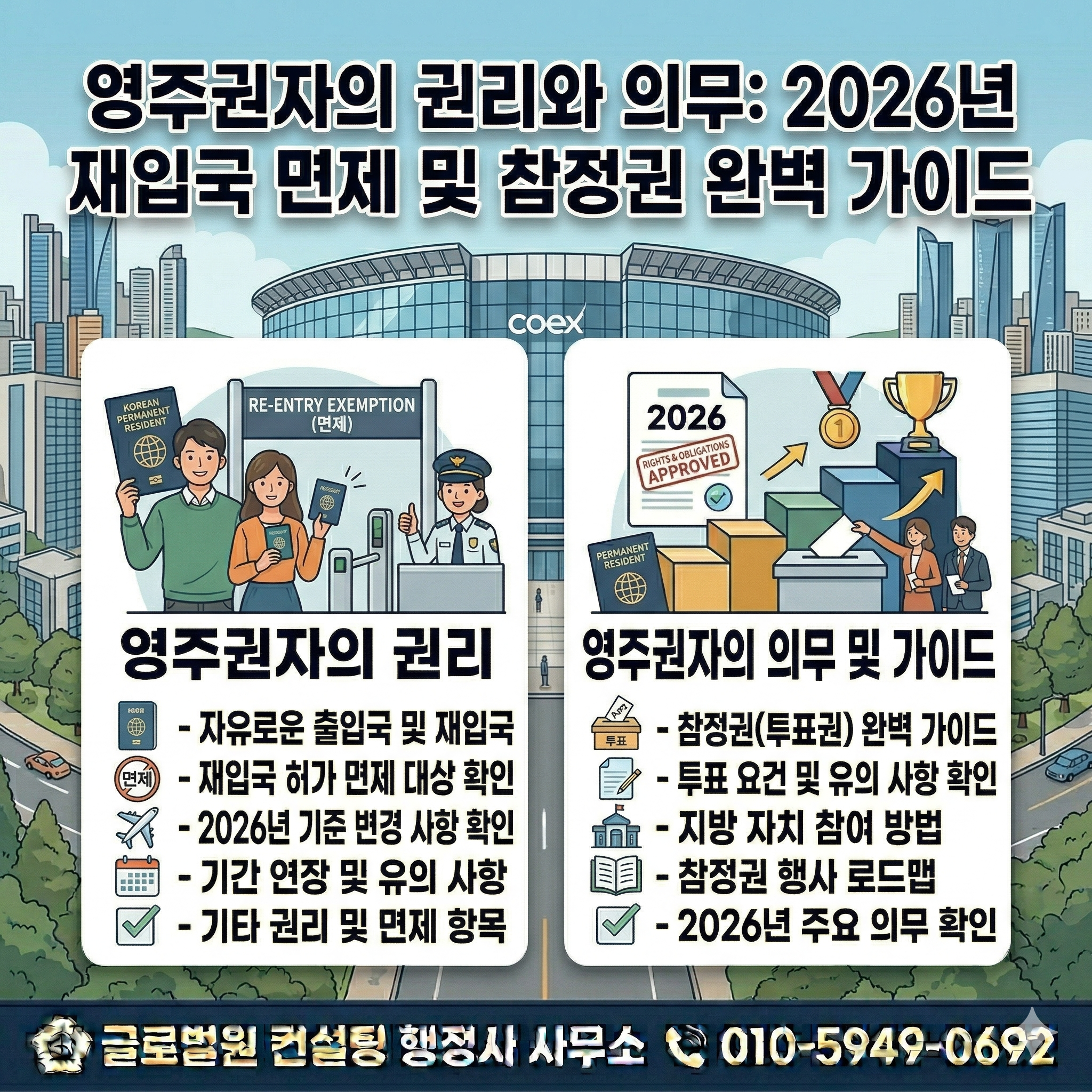 영주권자가 누리는 가장 실질적인 혜택은 **'출입국의 자유'**입니다. 2026년 3월 현재, 영주권(F-5) 소지자는 출국한 날로부터 2년 이내에 재입국할 경우 별도의 '재입국 허가'를 받을 필요가 없습니다. 일반 비자 소지자들이 1년 이내 재입국 시에만 면제받거나 별도의 허가를 신청해야 하는 것과 비교하면 압도적인 편의성입니다. 만약 질병이나 불가피한 사유로 2년 내에 돌아오지 못할 상황이라면, 반드시 해외 소재 한국 영사관을 통해 재입국 허가 연장 신청을 해야 영주권 상실을 막을 수 있습니다.