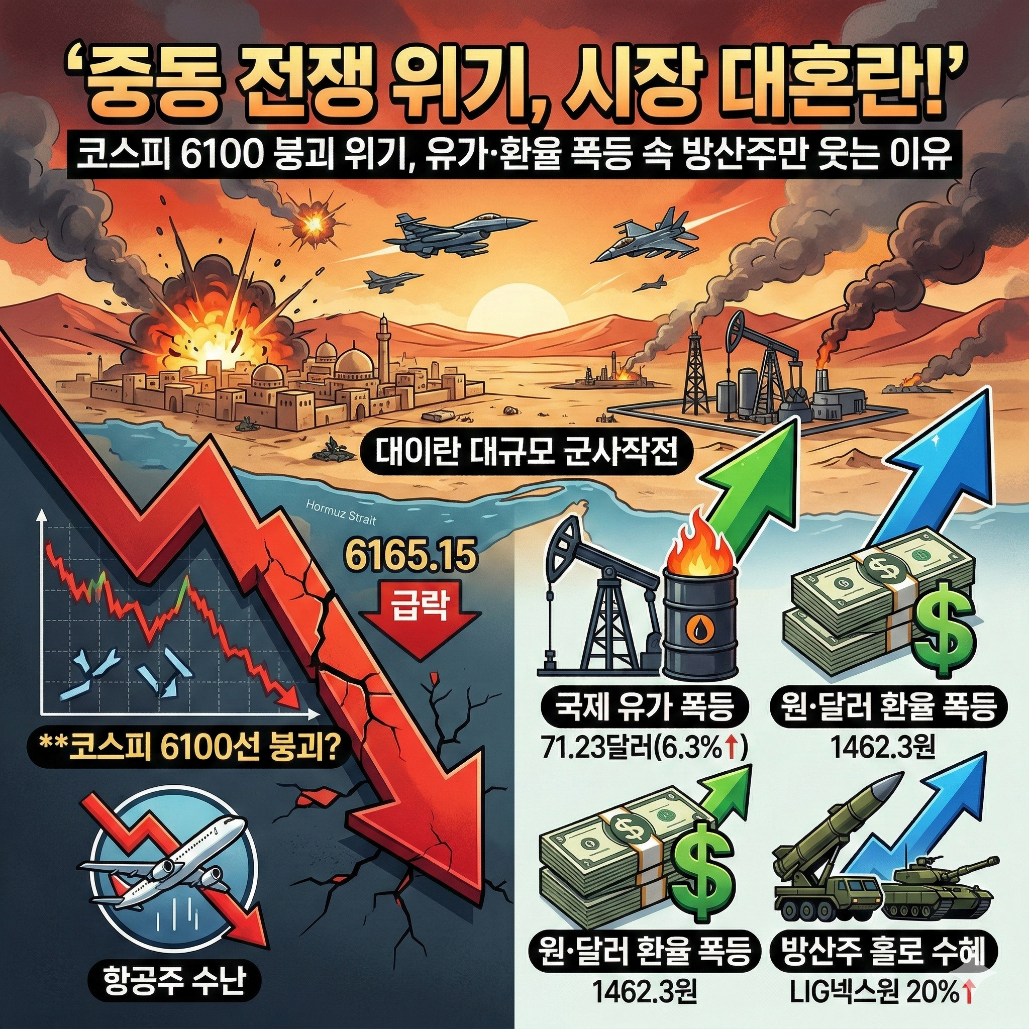 미국과 이스라엘의 대이란 대규모 군사작전이 시작되면서 글로벌 금융 시장이 요동치고 있습니다. 특히 국내 증시는 지정학적 리스크의 직격탄을 맞으며 코스피가 2%대 급락세를 보였는데요. 오늘은 긴박하게 돌아가는 시장 상황과 그 속에서 수혜를 입는 종목, 주의해야 할 업종을 정리해 드립니다.