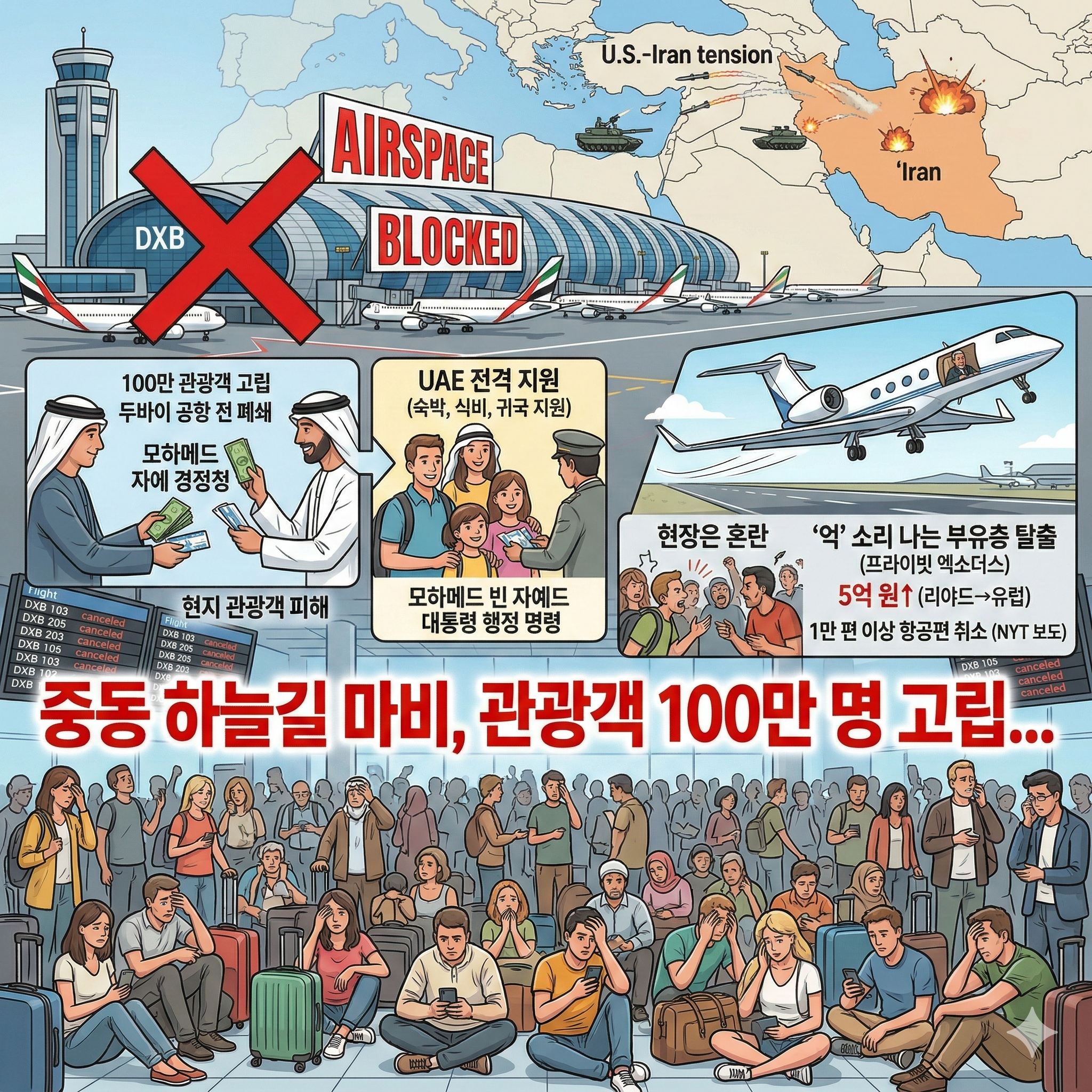 최근 미국과 이란 사이의 군사적 긴장이 최고조에 달하며 중동 지역의 '하늘길'이 사실상 봉쇄되었습니다. 단순한 군사적 충돌을 넘어, 세계 항공 물류의 허브인 중동의 마비는 전 세계 여행객들에게 직접적인 타격을 입히고 있습니다. 현재 현지에서 벌어지고 있는 긴박한 상황과 관광객 피해 현황을 사실 위주로 정리해 드립니다.