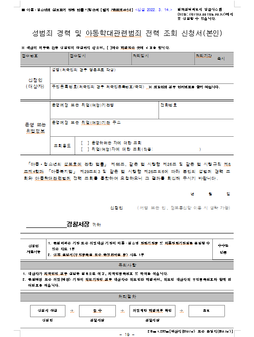 - 용도란에 반드시 **"범죄경력조회 신청용"**이라고 기재해야 합니다.