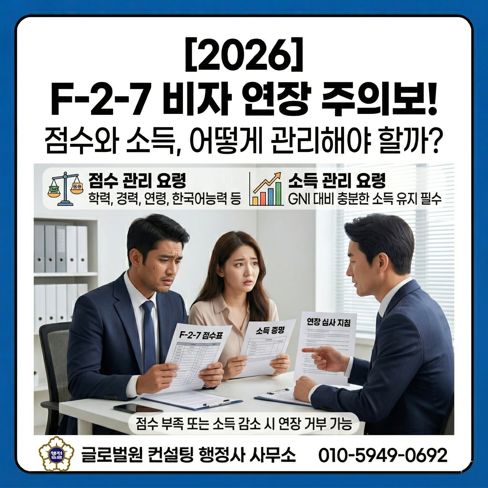 자유로운 취업과 이직이 가능해 '외국인들의 꿈의 비자'라 불리는 F-2-7! 하지만 연장 신청 시 점수가 미달하거나 소득 요건을 채우지 못해 비자가 취소되거나 단기 연장에 그치는 사례가 늘고 있습니다. 2026년 최신 지침에 따른 F-2-7 비자 유지 비결을 글로벌원 컨설팅 행정사 사무소에서 명확히 짚어드립니다.